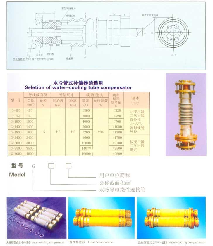 用于礦熱爐(電石爐、鐵合金爐、工業(yè)硅爐、黃磷爐等)短網(wǎng)系統(tǒng),既用于變壓器二次出線端與固定銅管的連接(補償器A型接頭并可用作電弧爐、鋼鐵爐補償器),也用于固定銅管與爐內(nèi)可動銅管(連接銅瓦)之間的連接一水冷電纜。其中補償器可補償安裝誤差,熱脹冷縮和吸收短網(wǎng)的電磁力引起的振動
